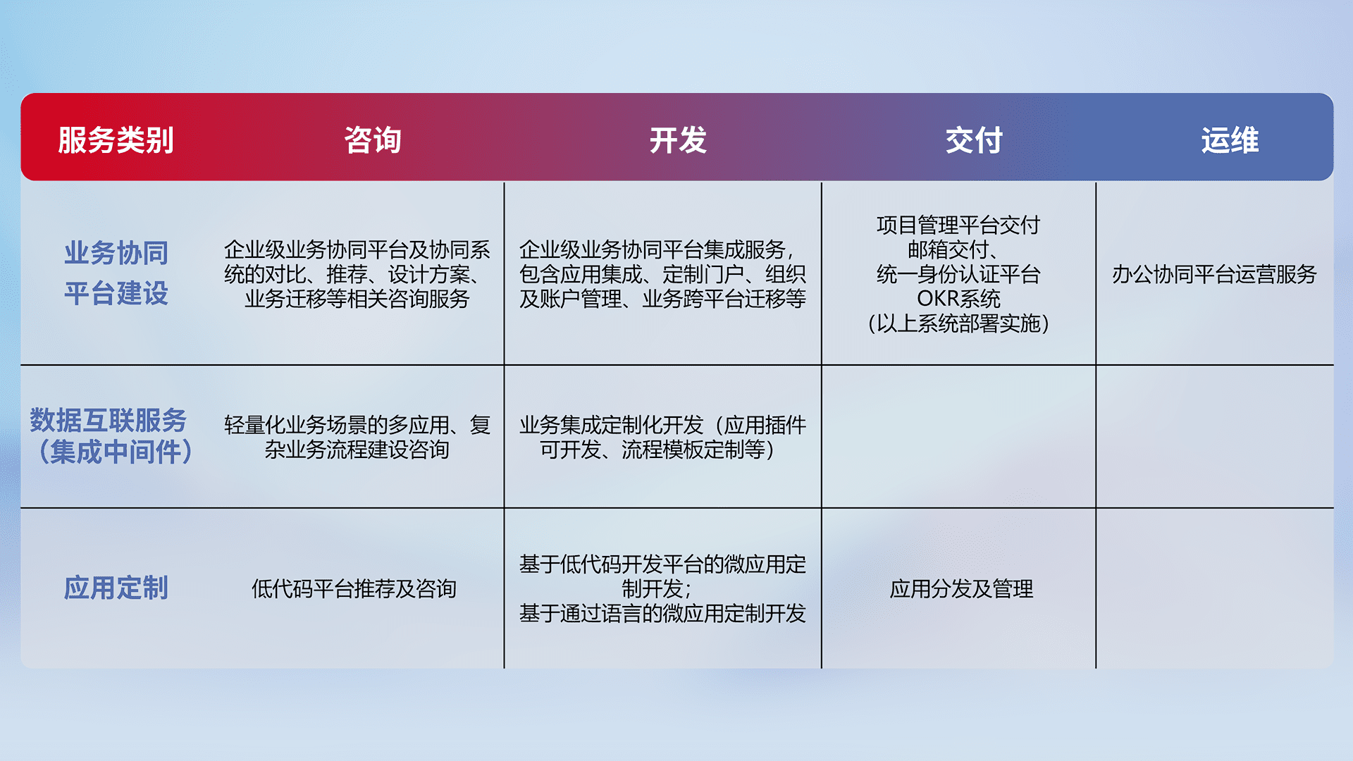 针对钉钉、、、企微、、、IDaas等平台级产品提供产品的规划、、、、方案、、、交付、、定制化开发等服务,,,实现如统一协同办公、、、智能客户服务、、、、混合会议管理、、智能数据查询、、等业务场景,,,实现数字化转型。。